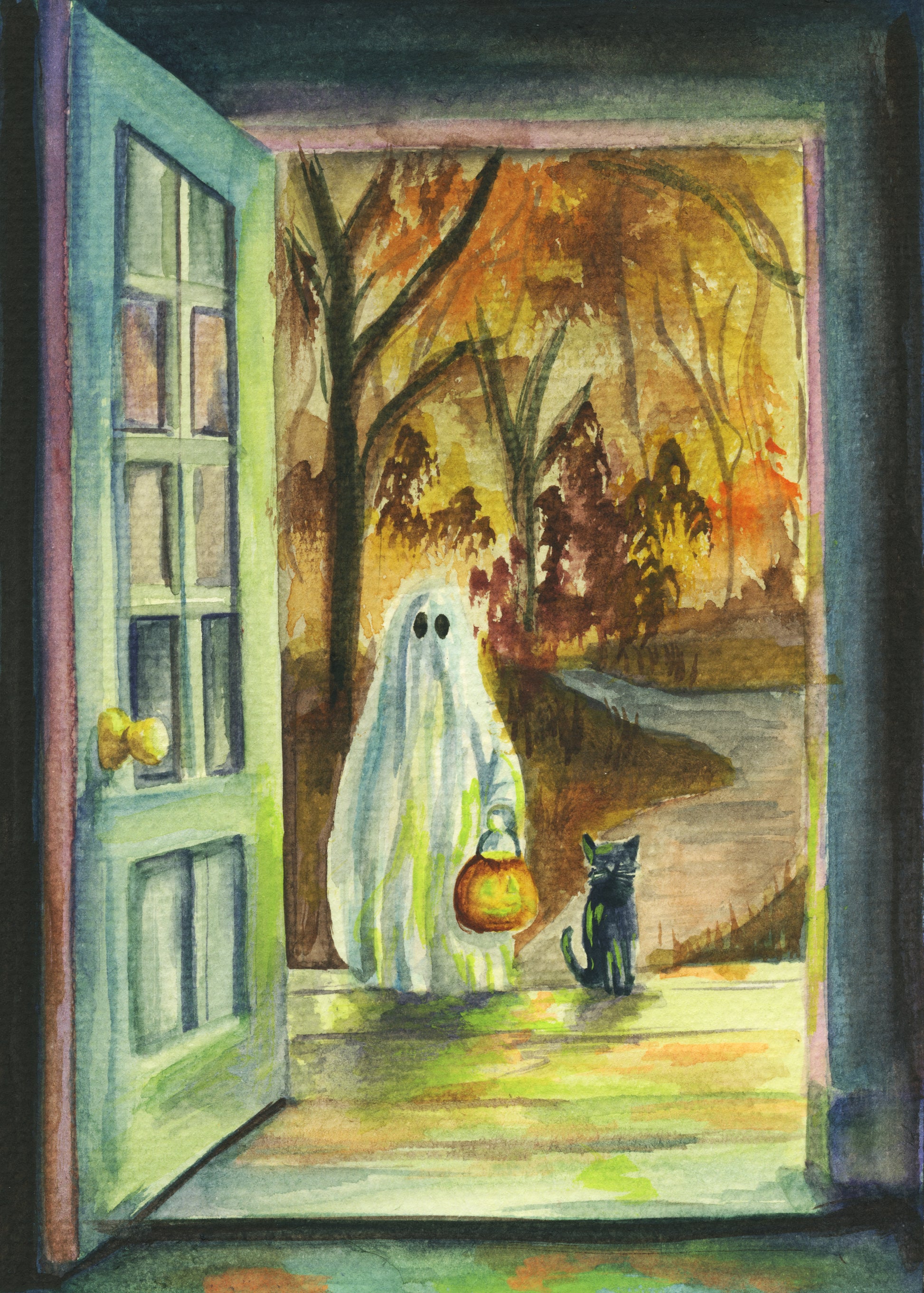 Golden Sprout is Day 13 of the 30 Day Print Series — a nostalgic Halloween evening scene featuring a small ghost and their black cat under golden autumn light. Painted in warm yellows and earthy greens, this piece captures the playful magic and quiet charm of October nights.